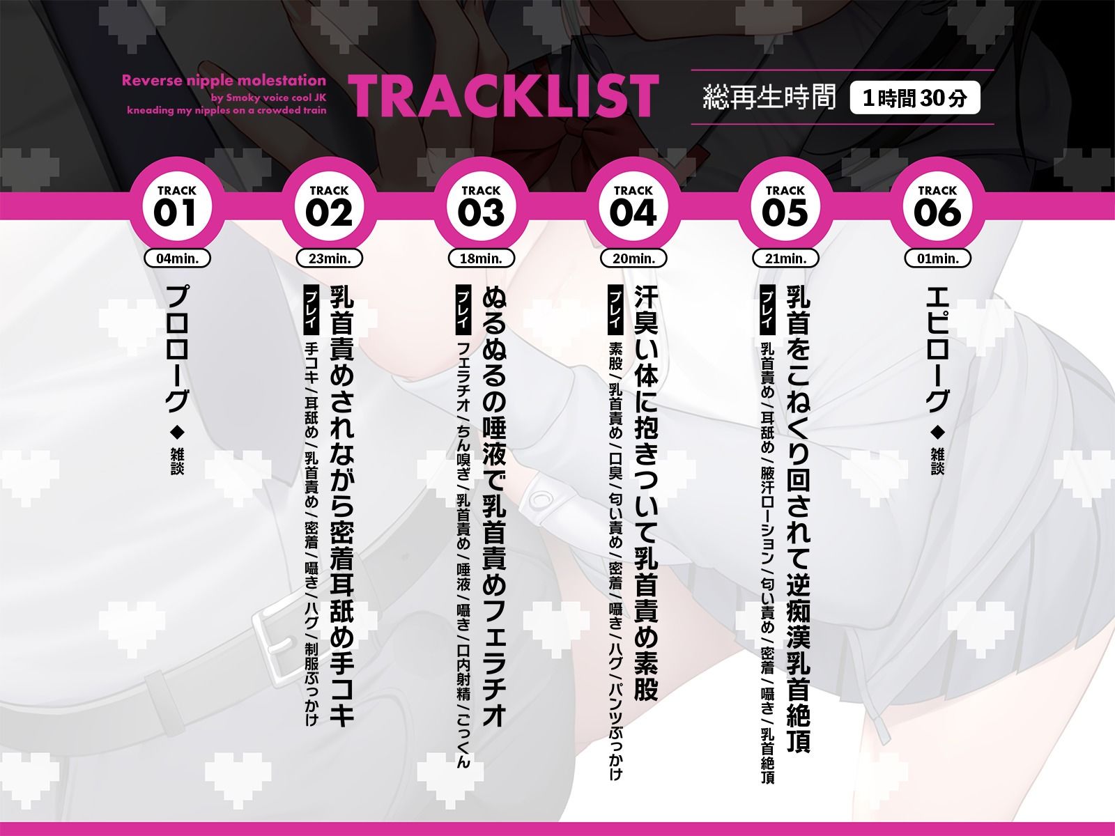 ジャンル: デモ・体験版あり、制服、処女、電車、クール攻め、男性向け、成人向け、耳舐め、女性優位、低音、乳首責め、本番なし
