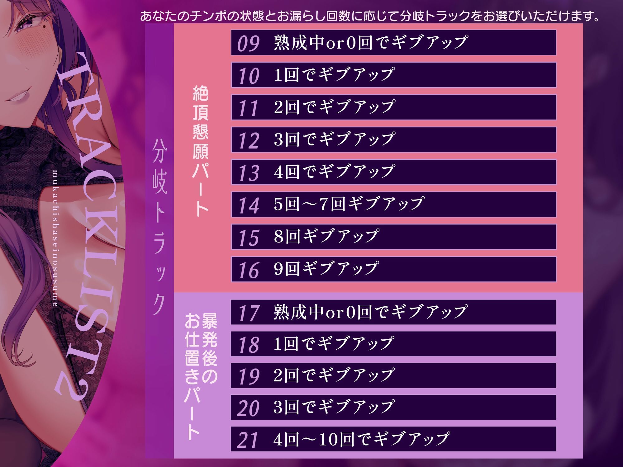 ↓あなたのチンポの状態とお漏らし回数に応じて分岐トラックをお選びいただけます。