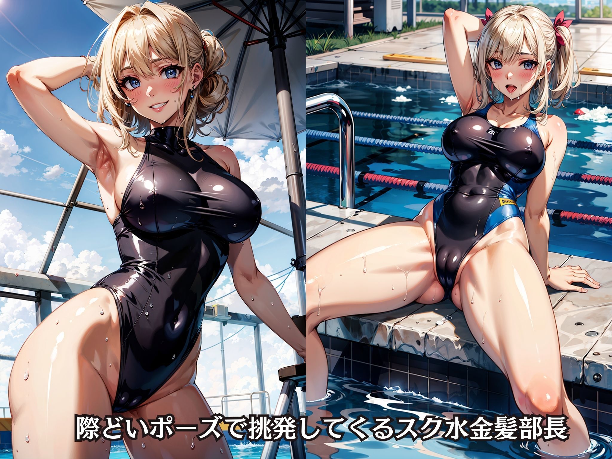 際どいポーズで挑発してくるスク水金髪JK部長。