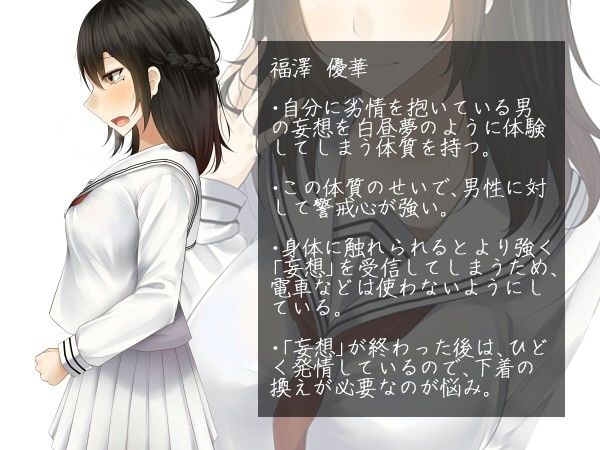 自分に劣情を持っている男の妄想を受信して、白昼夢のように追体験してしまう特殊体質の女の子がえっちな目にあうCG集です。