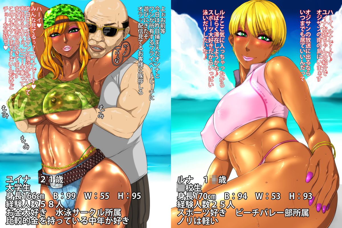 姉妹の黒ギャル姉のユイナ、妹のルナの二人を引き連れて自分が所有する「南の島」でセックスライブ三昧!!