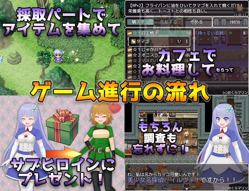 サブヒロインの好感度を上げ、特定条件をクリアするとサブヒロインのエロイベントも見ることが出来ます。採集で材料を採り、カフェで作ってもらってサブヒロインへプレゼントしましょう!