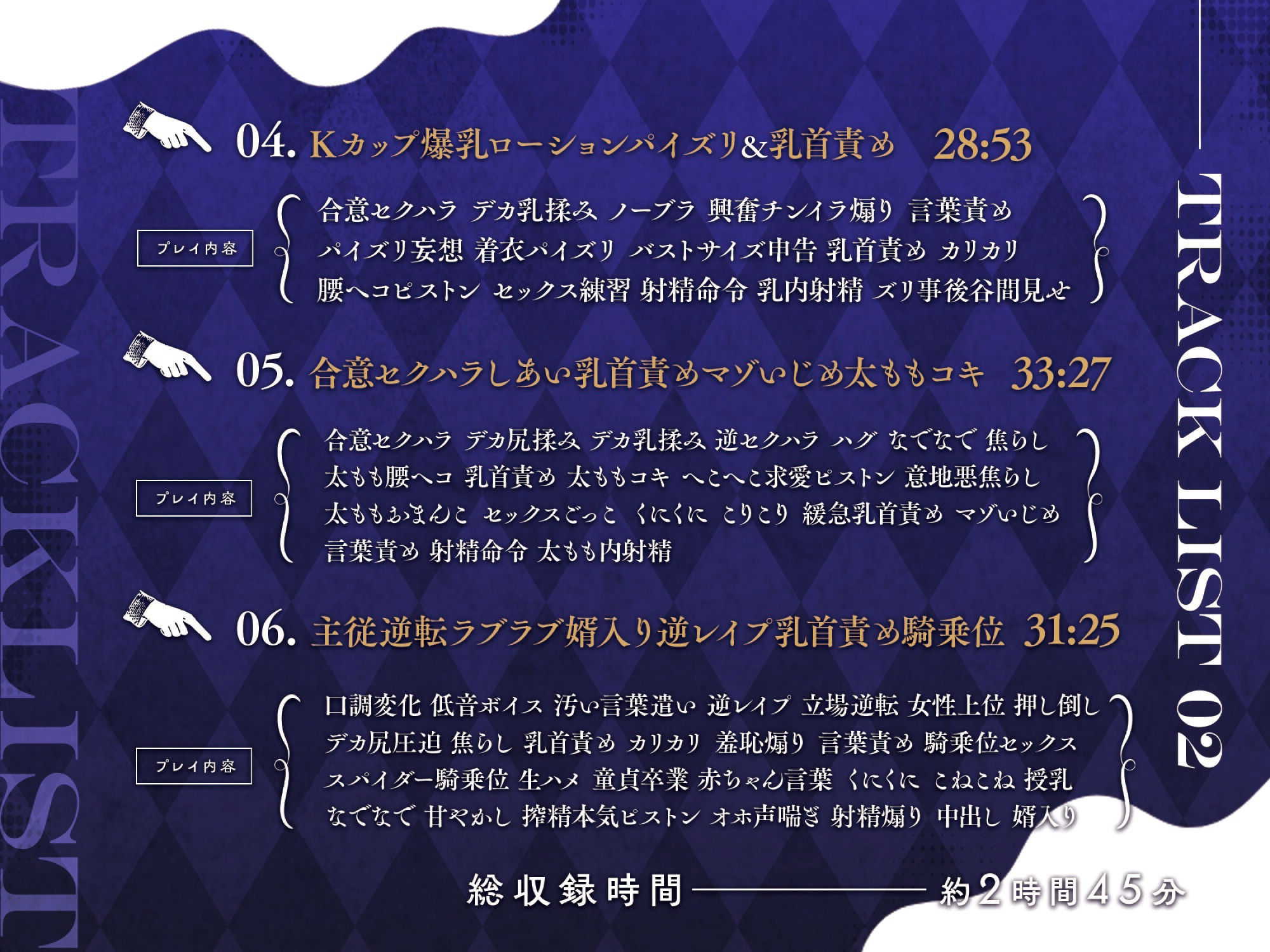 (プレイ内容:口調変化/低音ボイス/汚い言葉遣い/逆レ●プ/立場逆転/女性上位/押し倒し/デカ尻圧迫/焦らし/乳首責め/カリカリ/羞恥煽り/言葉責め/騎乗位セックス/スパイダー騎乗位/生ハメ/童貞卒業/赤ちゃん言葉/くにくに/こねこね/授乳/なでなで/甘やかし/搾精本気ピストン/オホ声喘ぎ/射精煽り/中出し/婿入り)
