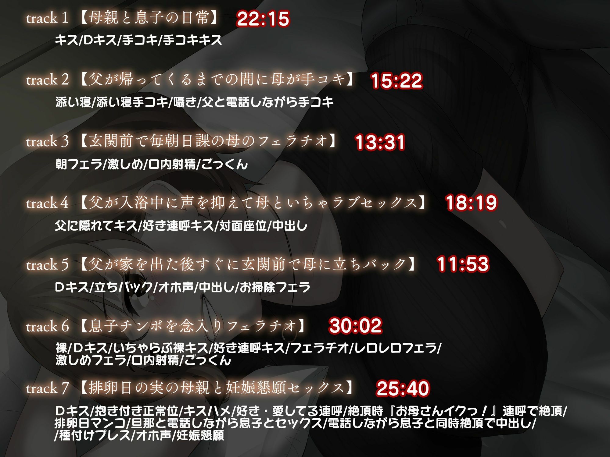 ジャンル: 近親相姦、中出し、フェラ、ラブラブ・あまあま、退廃・背徳・インモラル、母親、男性向け、成人向け、ささやき、歳の差、オホ声、KU100