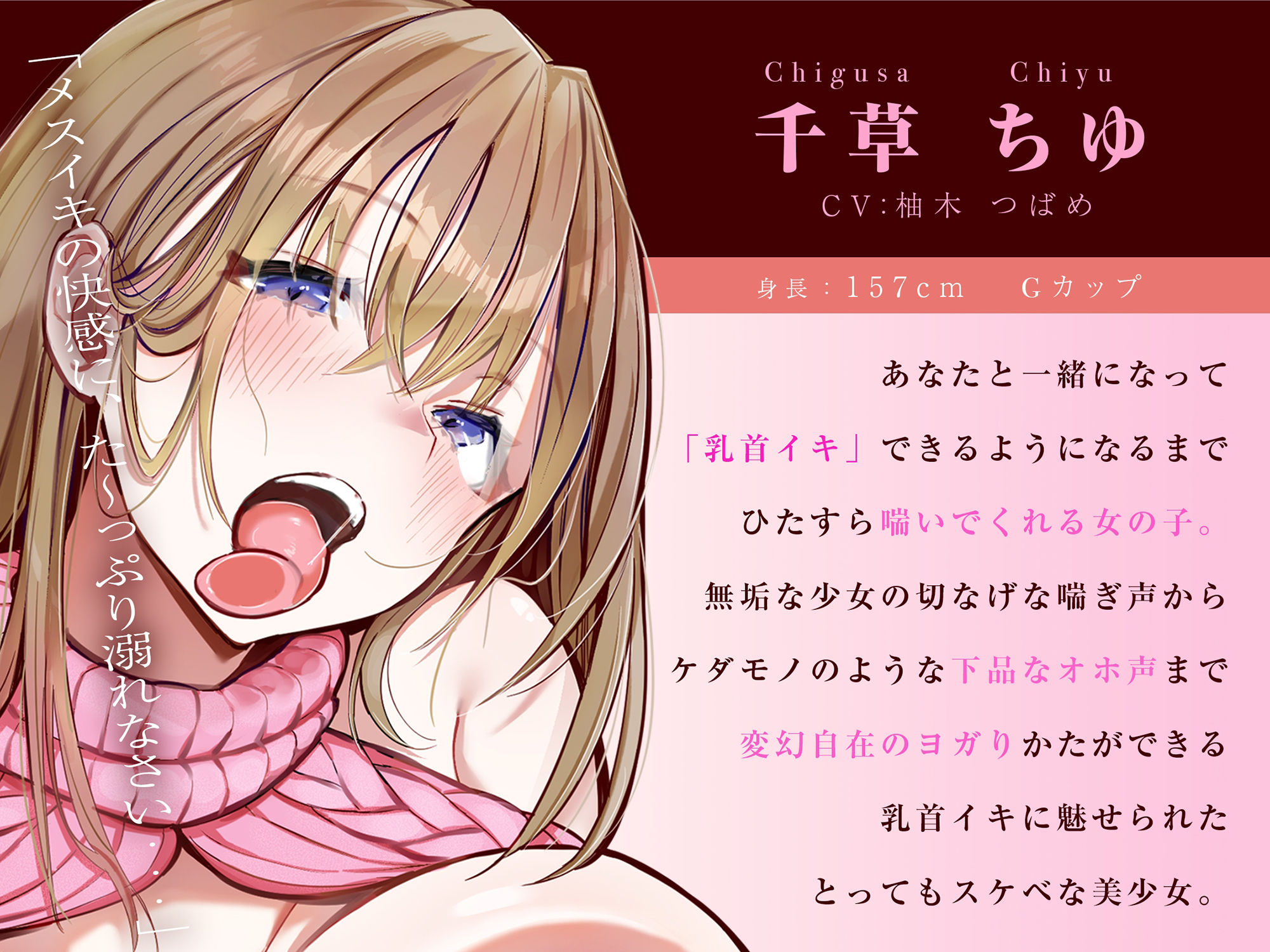 あなたと一緒になって「乳首イキ」できるようになるまでひたすら喘いでくれる女の子。無垢な少女の切なげな喘ぎ声から、ケダモノのような下品なオホ声まで変幻自在のヨガりかたができる、乳首イキに魅せられた、とってもスケベな美少女。
