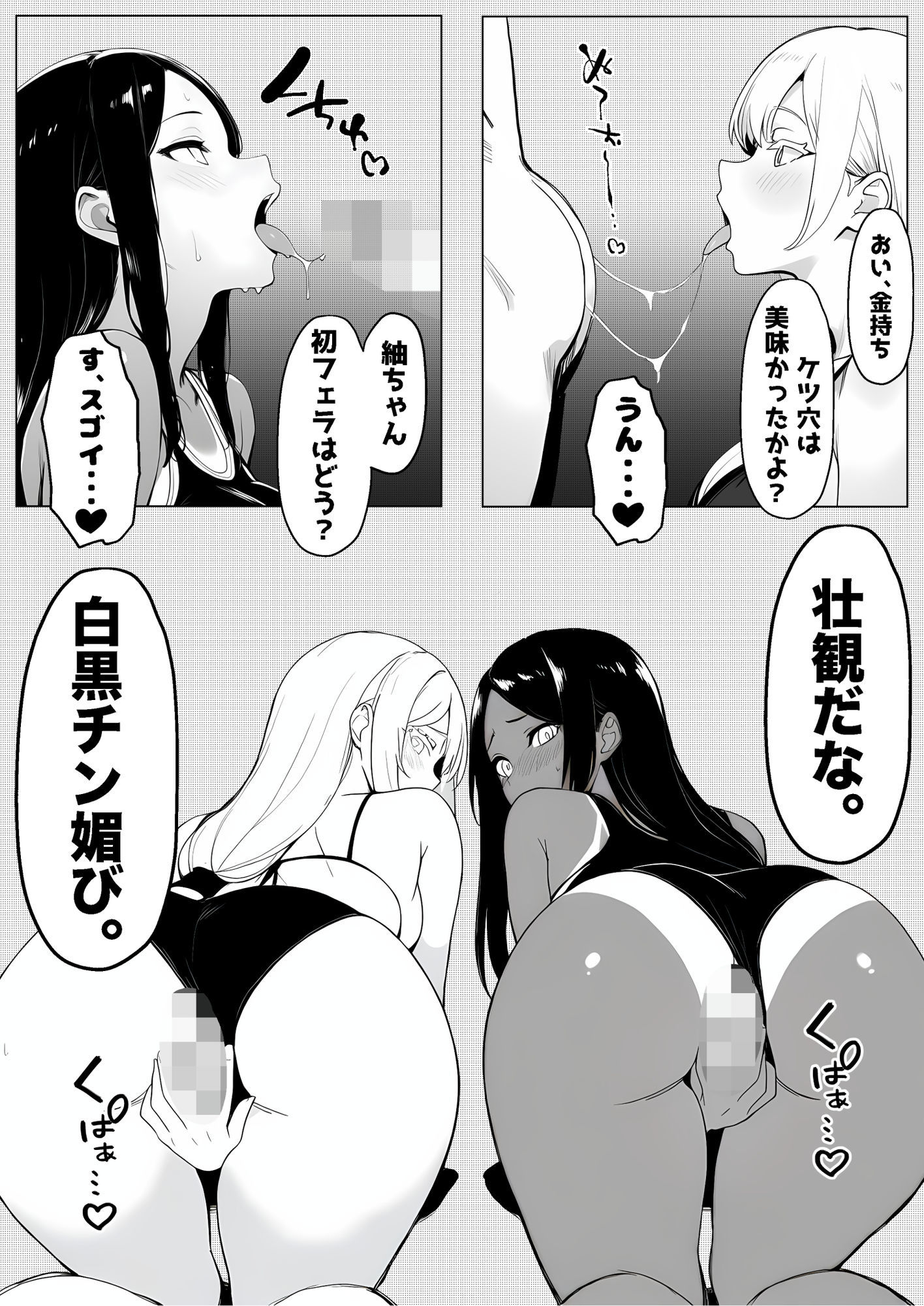 水泳の授業で好き勝手するためにプールサイドに移動。スク水から覗く日焼けがとびきりシコい、日焼けマンコの紬ちゃんを見つける(聞いたらなんと処女!)。彼女の乳首を舐めつつ、何か足りない気がしたら、デッキチェアでくつろぐビキニ姿の白マン・エマが目に入る。性奉仕の義務を拒否するエマは、時価総額百兆円に達する財閥の会長の娘らしい。当然成敗してやることに!白マンと黒マンのコントラストのシコさ!醜い性欲をサンドイッチ・アナル舐めフェラや、顔面潮吹きレズぶっかけの形で実現しながら、種付け作業で俺は少子化対策に貢献することになる!