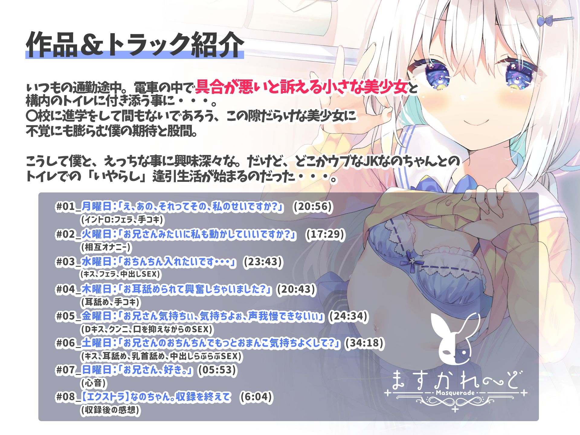通勤中に出会ったえっちでウブなJKとトイレで過ごすあまあまな1週間。 あらすじ